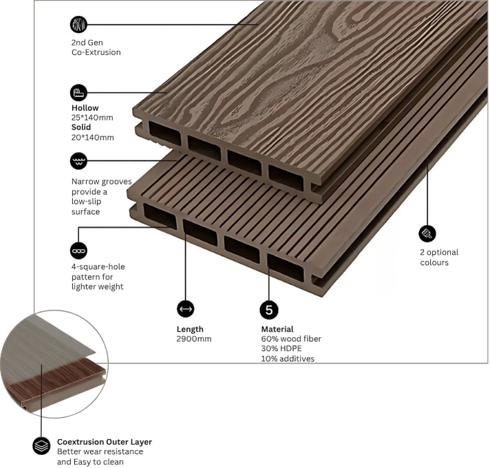 WPC Decking is “formaldehyde-free, non-radioactive, non-polluting, can be recycled,” etc., and completely replace the “class wood, aluminum, PVC plastic profile” and other non-renewable, energy consumption of products. It has been widely used in the “public buildings and facilities, landscape construction, integrated housing system construction, interior decoration,” and many other industries and fields. The product had passed the ISO 9001, ISO 14001, INTERTEK, BSCI, ASTM, CE and other system or product certification.